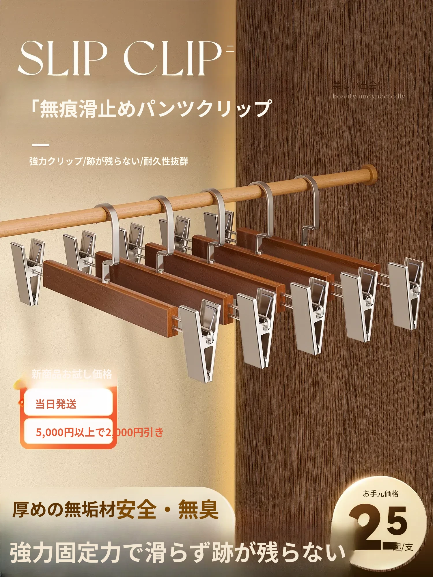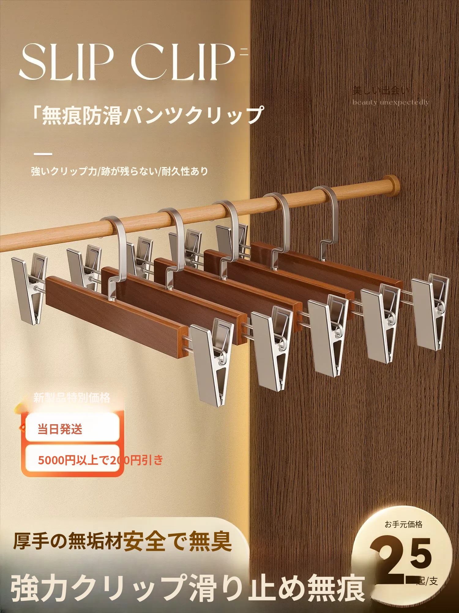 天然木製のパンツハンガー - 滑り止め機能付き、家庭用多機能パンツ&スカートクリップ、クローゼット内の必需品、衣料品店にも最適!