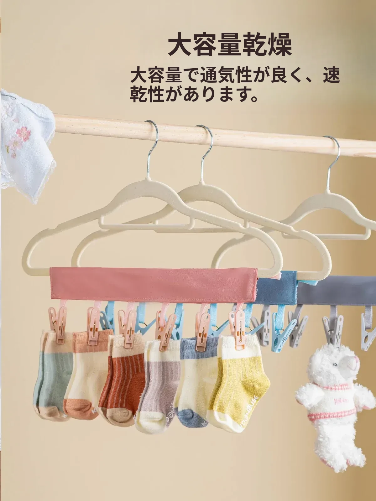 子供用ハンガー 家庭用クローゼット収納の必需品!よだれかけや靴下も干せる赤ちゃん専用多機能クリップハンガーで、スペースを有効活用しながらおしゃれにお片付け!