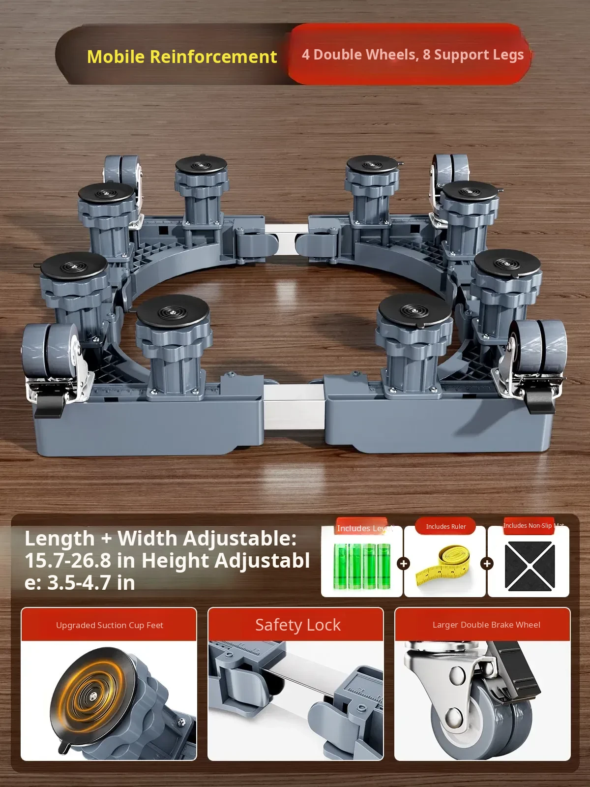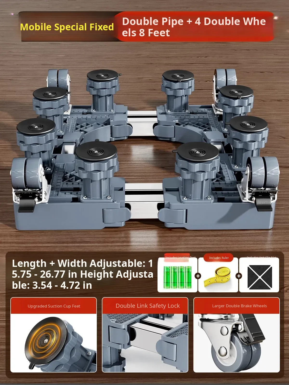 【Mobile & Stable】4 Dual-Wheel Casters with Brakes + 4 Support Legs + Dual Anti-Vibration Locks