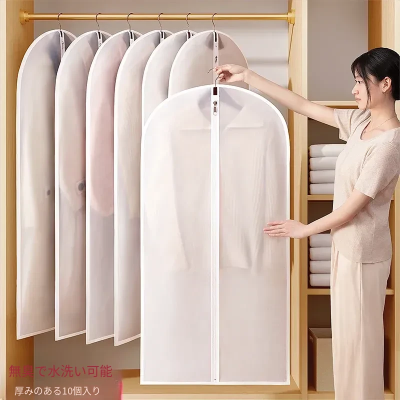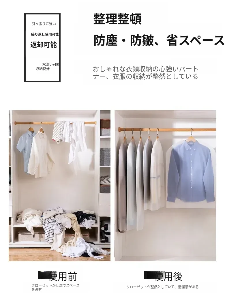日本製・防塵カバー付き衣類収納袋 - コートやダウンジャケットを守る透明ハンガー収納!家庭用に最適な大容量タイプで、お気に入りのスーツもすっきり整理。あなたの洋服をホコリから守ります!