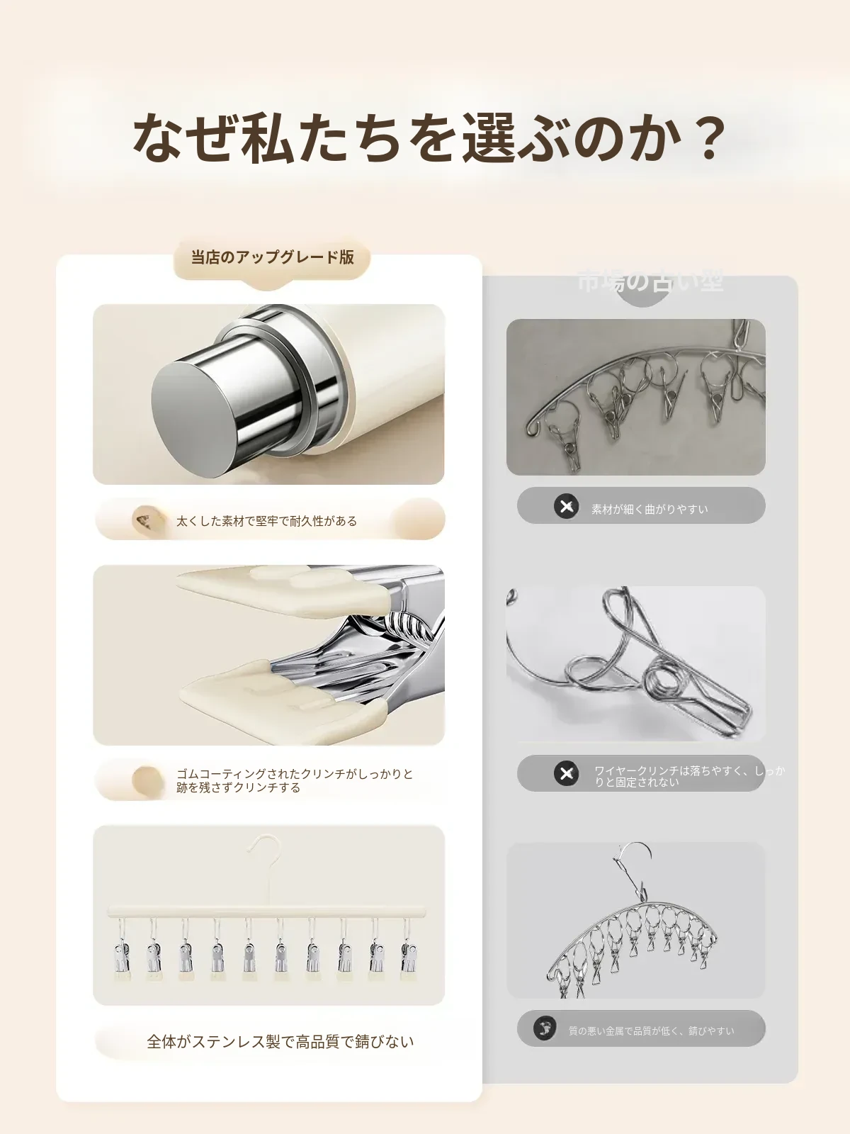 風に強い304ステンレス製衣類ハンガー固定クリップ - 滑り止め機能付き、屋外での洗濯物干しに最適!安心して衣類を固定できる耐久性抜群のアイテム!